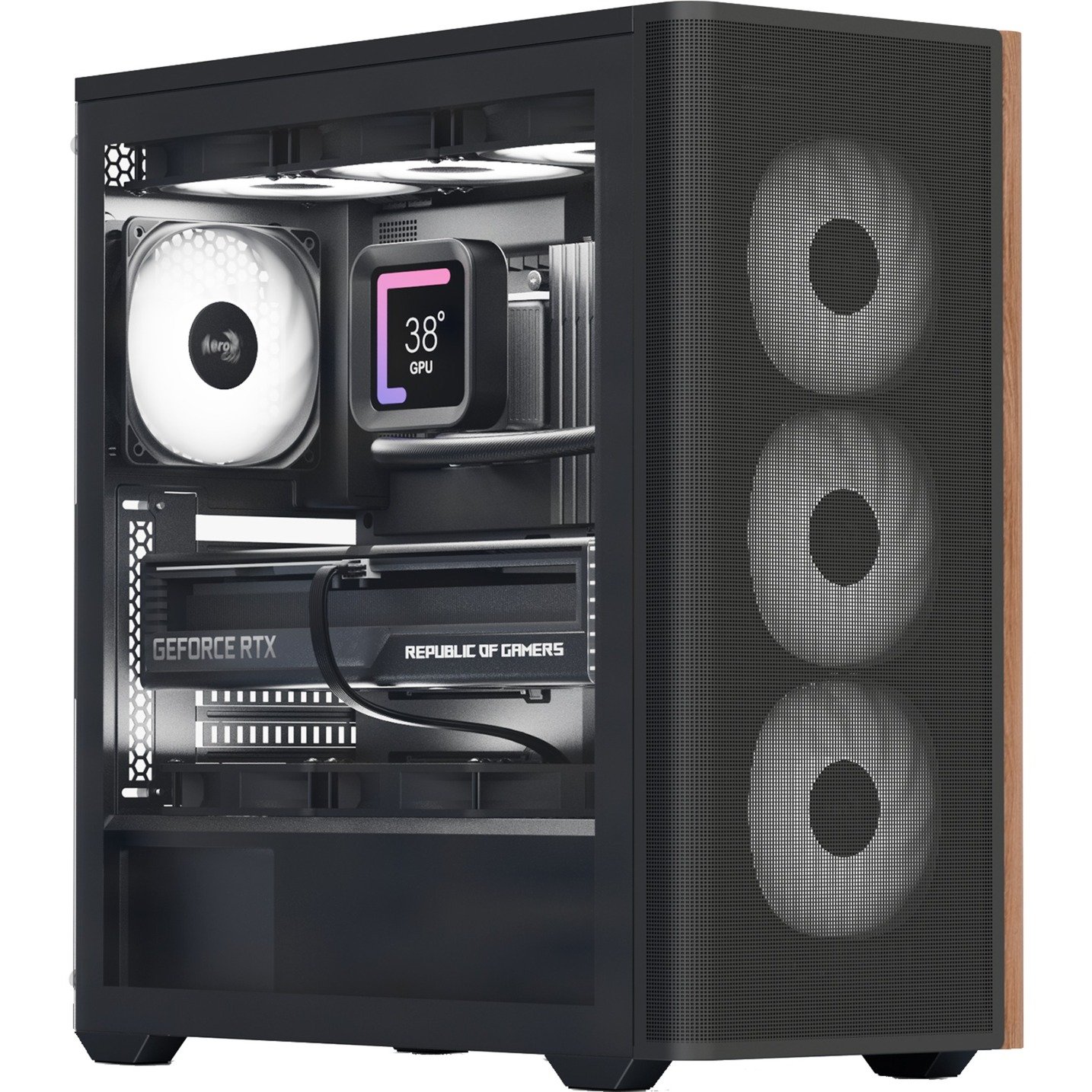 | Vorderseite | 3 x 120 mm ARGB-Lüfter vorhanden, alternativ 3 x 140 mm-Lüfter einbaubar | ||
