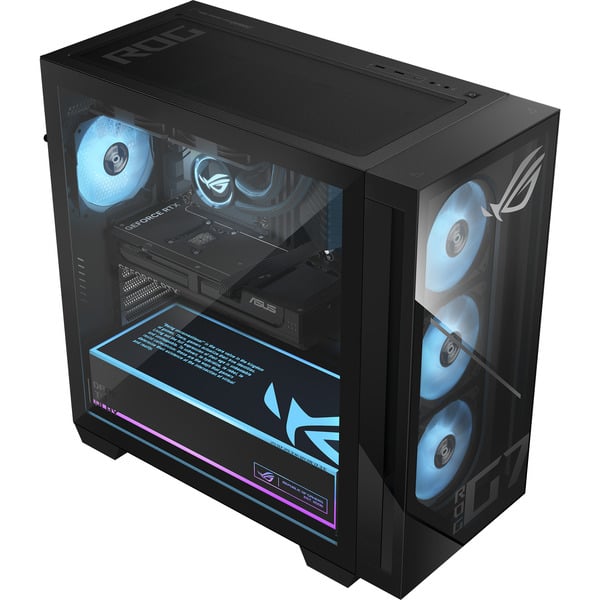 Der Asus ROG G700 besticht durch ein schwarzes, transparentes Midi-Tower-Gehäuse, das nicht nur optisch überzeugt, sondern auch funktional gestaltet ist. Das Gehäuse hat ein Volumen von 58 Litern und bietet ausreichend Platz für leistungsstarke Komponenten. Besonders hervorzuheben ist das Window Kit, das einen klaren Blick auf die Innenhardware ermöglicht. Die integrierte RGB-Beleuchtung der Lüfter sorgt für ein stimmungsvolles Ambiente und lässt sich nach deinen Wünschen anpassen.