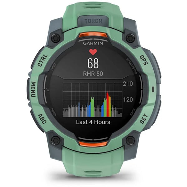 Der integrierte Lithium-Ionen-Akku bietet bis zu 18 Tage Betriebszeit, was die Garmin Instinct 3 zu einem idealen Begleiter für längere Reisen, Expeditionen oder Sportwochen macht. Im Energiesparmodus kann die Uhr sogar bis zu 24 Tage durchhalten, während im GPS-Modus eine Laufzeit von bis zu 68 Stunden möglich ist. Selbst bei voller Nutzung aller Satellitensysteme und Multiband-Tracking hält die Uhr bis zu 23 Stunden durch.